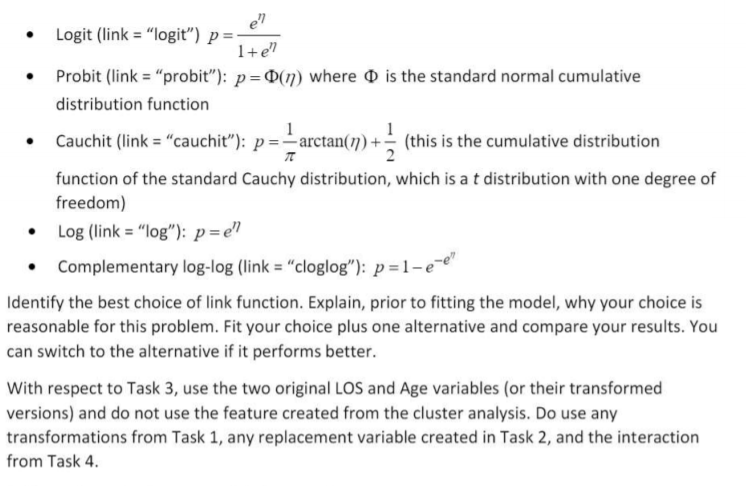 "With the target variable being only 0 or 1, the binomial distribution is the only reasonable choice. Your assistant has done some research and learned that for the glm package in R, five link functions could be used with the binomial distribution. They are shown below (the inverse of the link function is presented here as it represents how the linear predictor is transformed into the actual response), where \(\nu\) is the linear predictor and \(\p\) is the response.