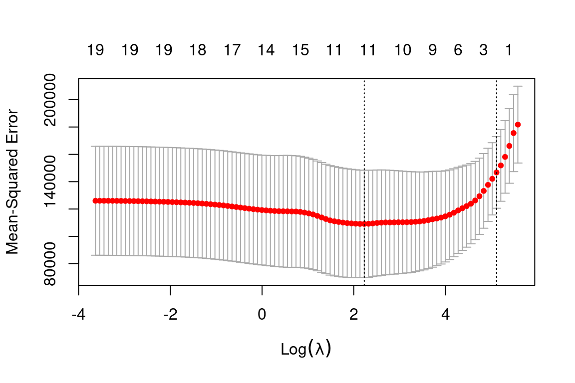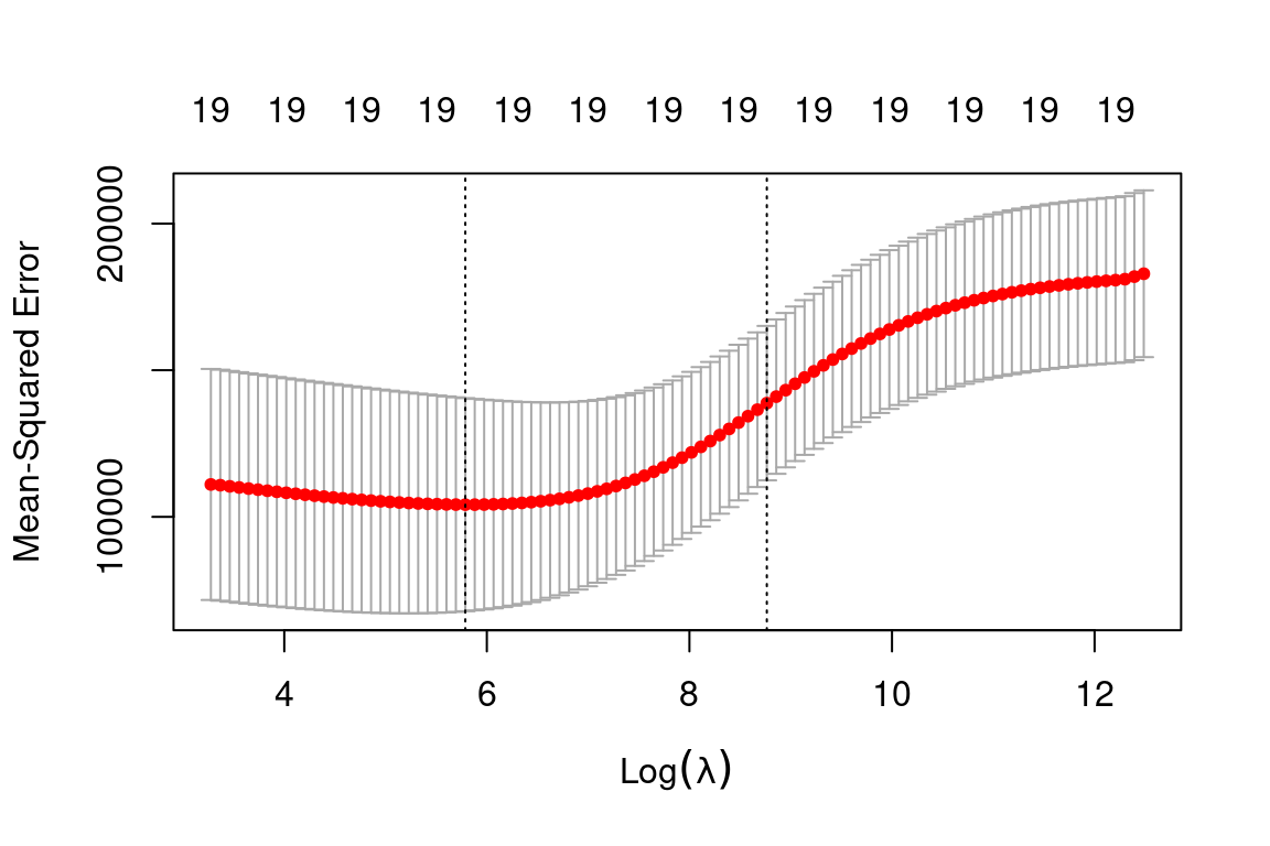 plot(cv.out) # Draw plot of training MSE as a function of lambda